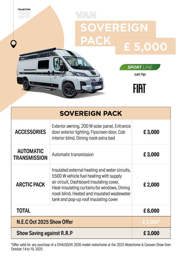 Offers valid for any purchase of a Chausson 2026 motorhome made during the Motorhome & Caravan Show, from 15 to 19 October 2025.