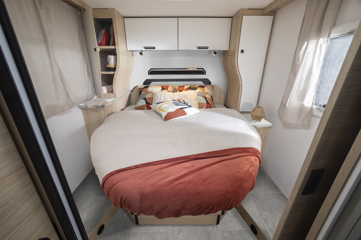 What’s more, with the central bed you can have a proper bedroom just like at home. . Indeed, its central location means storage options can be installed on both sides of the bed, creating a practical and accessible storage area. For example, you could store your clothes and bedsheets there without cluttering the rest of the motorhome. Thanks to its central location, you can also set up a bedside table on both sides of the bed.